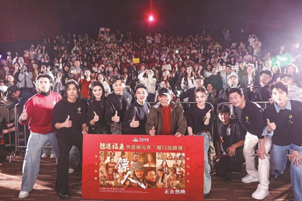 3月4日讯(导报记者 曾宇姗/文 沈威/图)昨天,马年春节档武侠巨制贺岁片《镖人:风起大漠》(以下简称《镖人》)全国路演收官站在厦门圆满举办,导演袁和平,领衔主演吴京、于适、孙艺洲及一众主创人员走进厦门多个影院,与观众们近距离互动交流。
